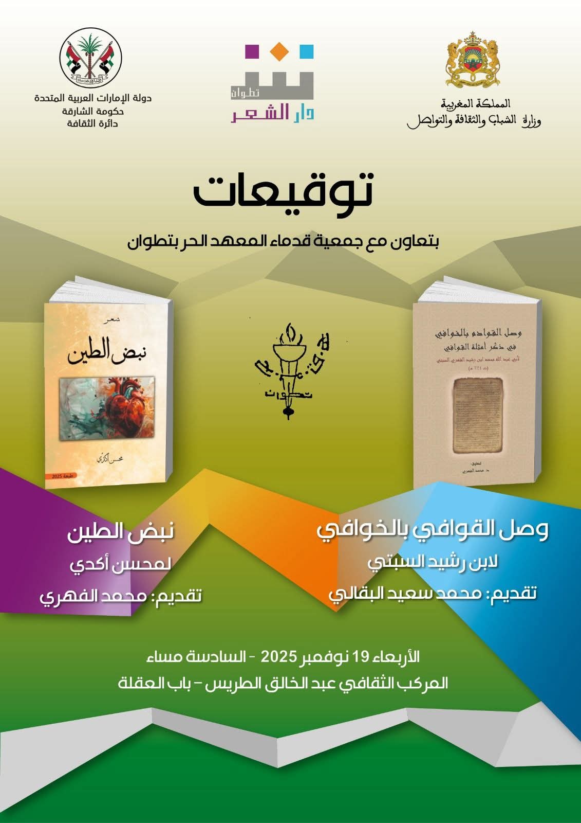 ويشهد اللقاء تقديم وتوقيع كتاب “وصل القادم بالخوافي في ذكر أمثلة القوافي”، لمحمد بن رشيد السبتي، بتحقيق محمد الفهري ويقدمه محمد سعيد البقالي، كما يشهد اللقاء توقيع وتقديم ديوان “نبض الطين” لمحسن أكدي، ويقدمه محمد الفهري.