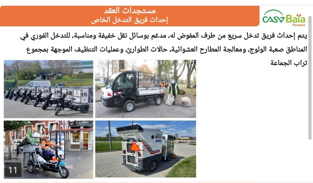 ومن بين مستجدات دفتر التحملات الجديد “إحداث فريق تدخل سريع من طرف المفوض له، مدعّم بوسائل نقل خفيفة ومناسبة، للتدخل الفوري في المناطق صعبة الولوج، ومعالجة المطارح العشوائية، حالات الطوارئ، وعمليات التنظيف الموجهة بمجموع تراب الجماعة.