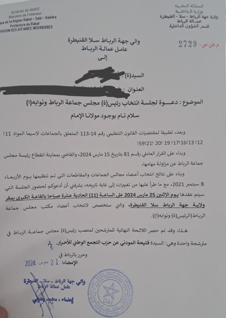 وقال الوالي في دعوته للعضوات والأعضاء انه يدعوهم إلى الحضور الى الجلسة التي سيتم عقدها يوم الاثنين 25 مارس 2024 على الساعة الحادية عشرة صباحا بالقاعة الكبرى بمقر ولاية الرباط، ستخصص لانتخاب أعضاء مكتب مجلس جماعة الرباط.