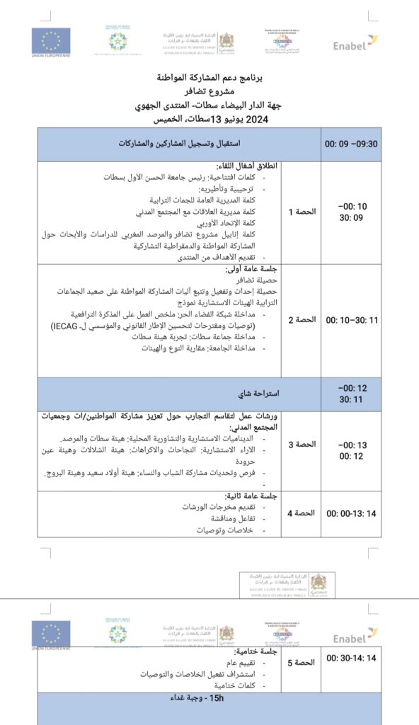 وفي هذا السياق، ينظم مشروع تضافر”، الذي تنفذه وكالة التنمية البلجيكية، بشراكة مع المديرية العامة للجماعات الترابية التابعة لوزارة الداخلية والوزارة المنتدبة لدى رئيس الحكومة المكلفة بالعلاقات مع البرلمان (مديرية العلاقات مع المجتمع المدني، سلسلة من خمس منتديات في الجهات المذكورة أعلاه، من أجل تبادل ورسملة الممارسات الجيدة في مجال المشاركة المواطنة والاستفادة منها، وتسهيل التبادل بين الجماعات على المستوى المحلي.