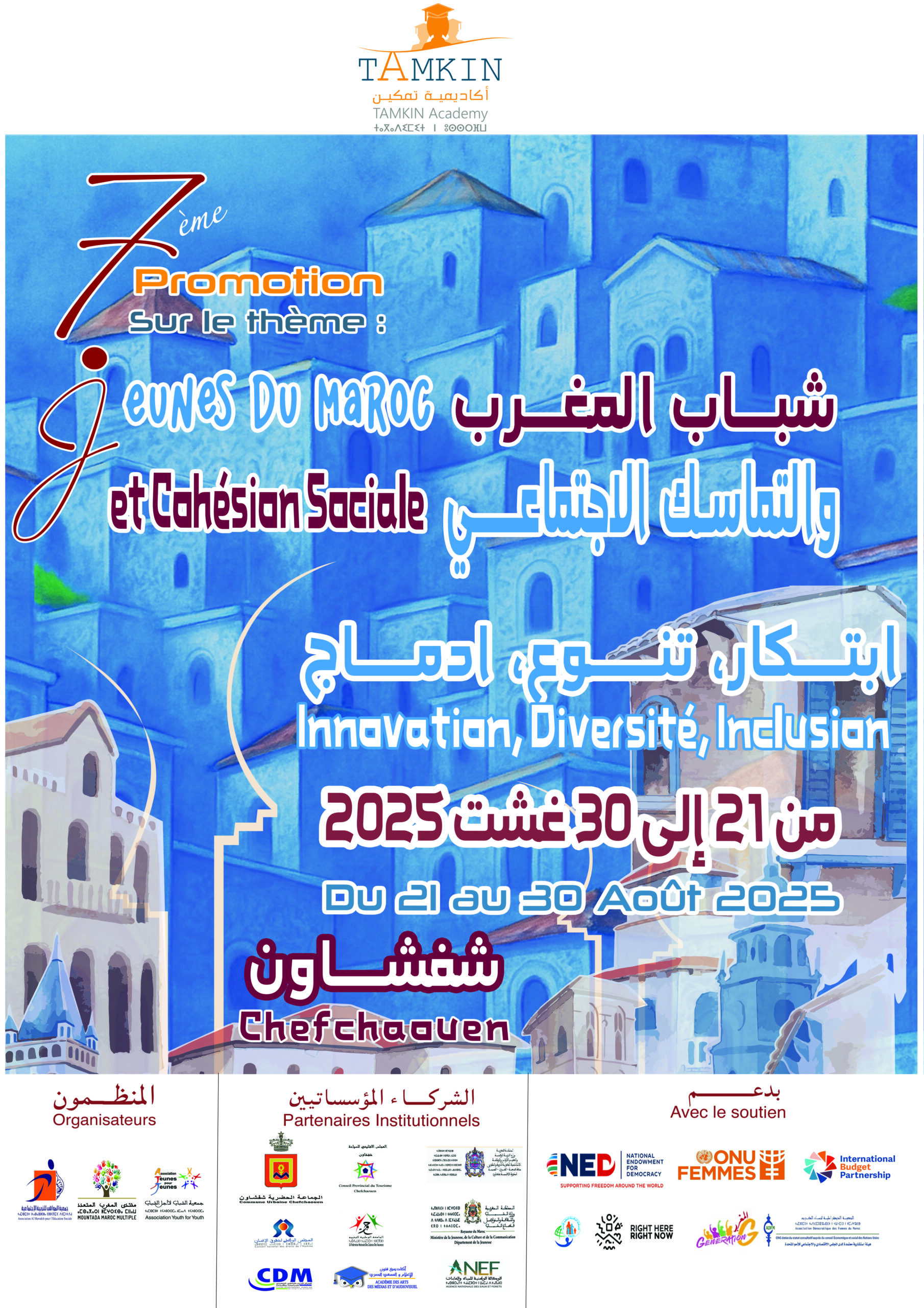 تحتضن مدينة شفشاون في الفترة المتراوحة ما بين 21 و31 من شهر غشت الجاري، الدورة السابعة من أكاديمية تمكين، التي تنظم هذه السنة تحت شعار “شباب المغرب والتماسك الإجتماعي : إبتكار، تنوع، وإدماج”.
