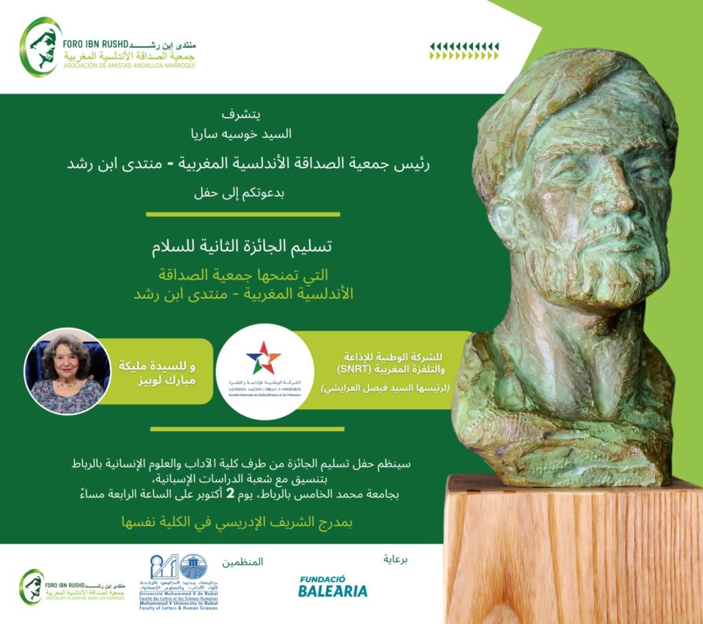 سيعود اسم ابن رشد، يوم الخميس 2 أكتوبر 2025، إلى الحياة في قلب الرباط، عبر النسخة الثانية من جوائز ابن رشد للتوافق، التي تنظّمها جمعية الصداقة الأندلسية المغربية، تحت رعاية مؤسسة بالياريا، في كلية الآداب والعلوم الإنسانية بجامعة محمد الخامس. حيث تحتضن كلية الآداب الحفل الرسمي لتسليم النسخة الثانية من الجائزة لكلٍّ من الشركة الوطنية للإذاعة والتلفزة المغربية (SNRT)، التي جعلت من اللغة الإسبانية جسرًا حيًّا للتواصل عبر نشرات الأخبار والبرامج الموجهة للعالم الناطق بالإسبانية منذ أكثر من ثلاثة عقود، في خطوة تعبّر عن وعي استراتيجي بمكانة المشترك التاريخي والثقافي. والمستعربة والمترجمة الإسبانية المغربية مليكة امبارك لوبيز، التي كرّست حياتها لجعل الإسبانية لغة لقاء، وجسرت بها أدب المغرب والعالم العربي إلى القارئ الإسباني، لتجعل من الكتابة جسرًا آخر يوازي الدبلوماسية، لكنه أعمق وأبقى.