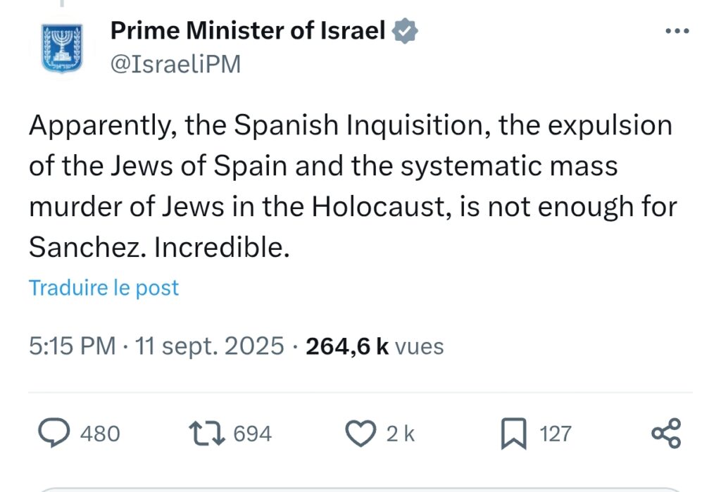 وفي تغريدة أخرى،لها علاقة بنفس الرد،ذكر بنيامين نتانياهو رئيس الحكومة الإسبانية بما وقع في الماضي قائلا:«يبدو أن محاكم التفتيش الإسبانية حيث تم طرد اليهود من إسبانيا والقتل الجماعي المنظم لليهود خلال الهولوكوست، ليست كافية بالنسبة لسانتشيث.إنه أمر لا يصدق».