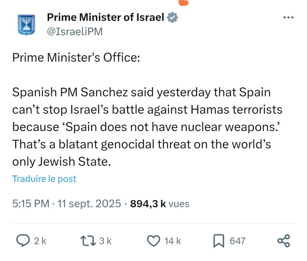 بعد تصريح رئيس الحكومة الإسبانية، بيدرو سانشيز، بأن : «إسبانيا ليس بمقدورها توقيف الحرب التي تشنها إسرائيل على حماس لأن إسبانيا ليس لها أسلحة نووية..» رد رئيس حكومة الاحتلال الإسرائيلي في تغريدة له على حسابه الرسمي بشبكة التواصل الاجتماعي«X»قائلا :«أعلن رئيس الوزراء الإسباني سانشيز أمس أن إسبانيا لا تستطيع وقف حرب إسرائيل ضد إرهابيي حماس لأن إسبانيا لا تمتلك قنابل نووية. هذا تهديد إبادة جماعية صارخ ضد الدولة اليهودية الوحيدة في العالم..»