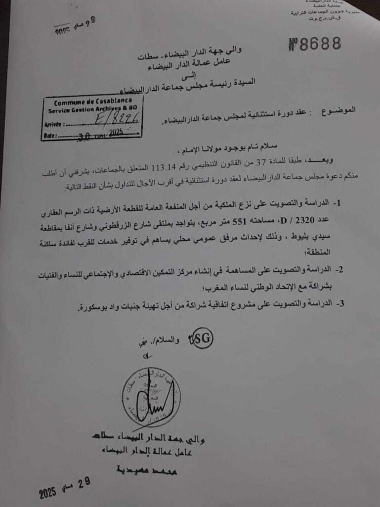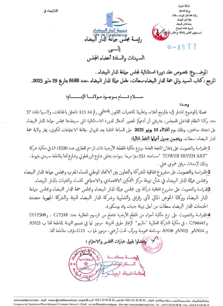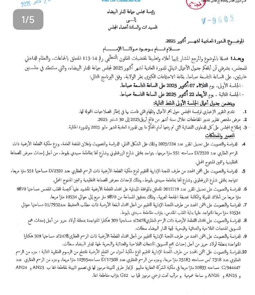 ووجهت نبيلة الرميلي، رئيسة جماعة الدارالبيضاء دعوات الى عضوات وأعضاء المجلس تخبرهم بتاريخ عقد الدورة العادية لشهر أكتوبر من سنة 2025 مع جدول أعمالها.