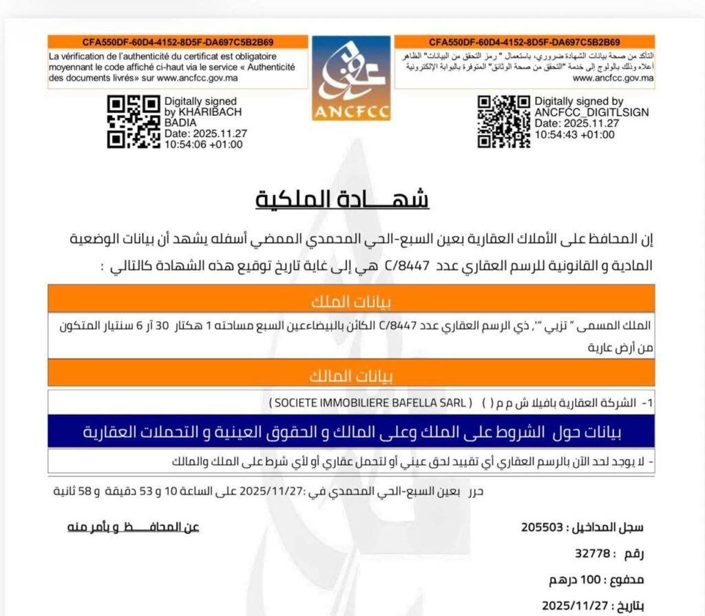 وبعد مرور تسعة أشهر تقريبا أصبحت هذه البقعة الارضية في ملك شركة خاصة هي شركة عقارية كما يؤكد ذلك شهادة ملكية صادرة عن نفس المحافظة بتاريخ 27 نونبر 2025 مع تصنيفها ارض عارية دون تخصيص كمساحة خضراء.