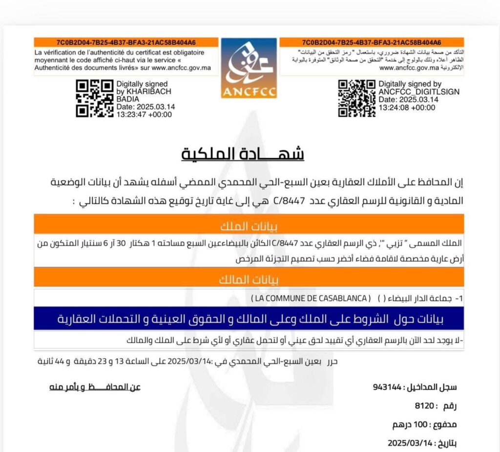 وحسب شهادة الملكية صادرة بتاريخ 14 مارس 2025 عن محافظ الاملاك العقارية بعين السبع الحي المحمدي تبين ان البقعة الارضية والتي تبلغ مساحتها اكثر من هكتار في ملكية جماعة الدارالبيضاء عبارة عن أرض عارية مخصصة لفضاء اخضر.