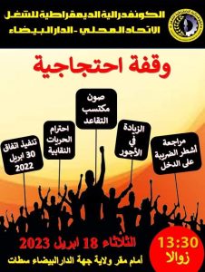 أعلن الاتحاد المحلي للكونفدرالية الديمقراطية للشغل، عن تنظيم وقفة احتجاجية، يوم الثلاثاء القادم، امام مقر ولاية الدارالبيضاء